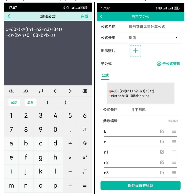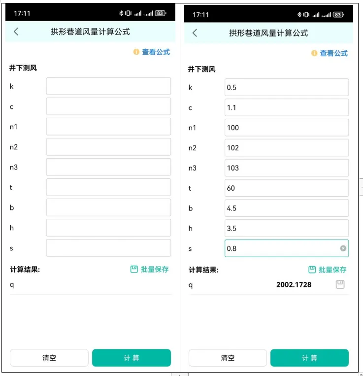 公式保存好以后,可以一直用,每次使用时,只需要输入变化的参数,就可快速计算出风量。建议可以根据不同的巷道断面,多设置几个公式,这样以后每次测风时就不用再进行复杂的计算了。