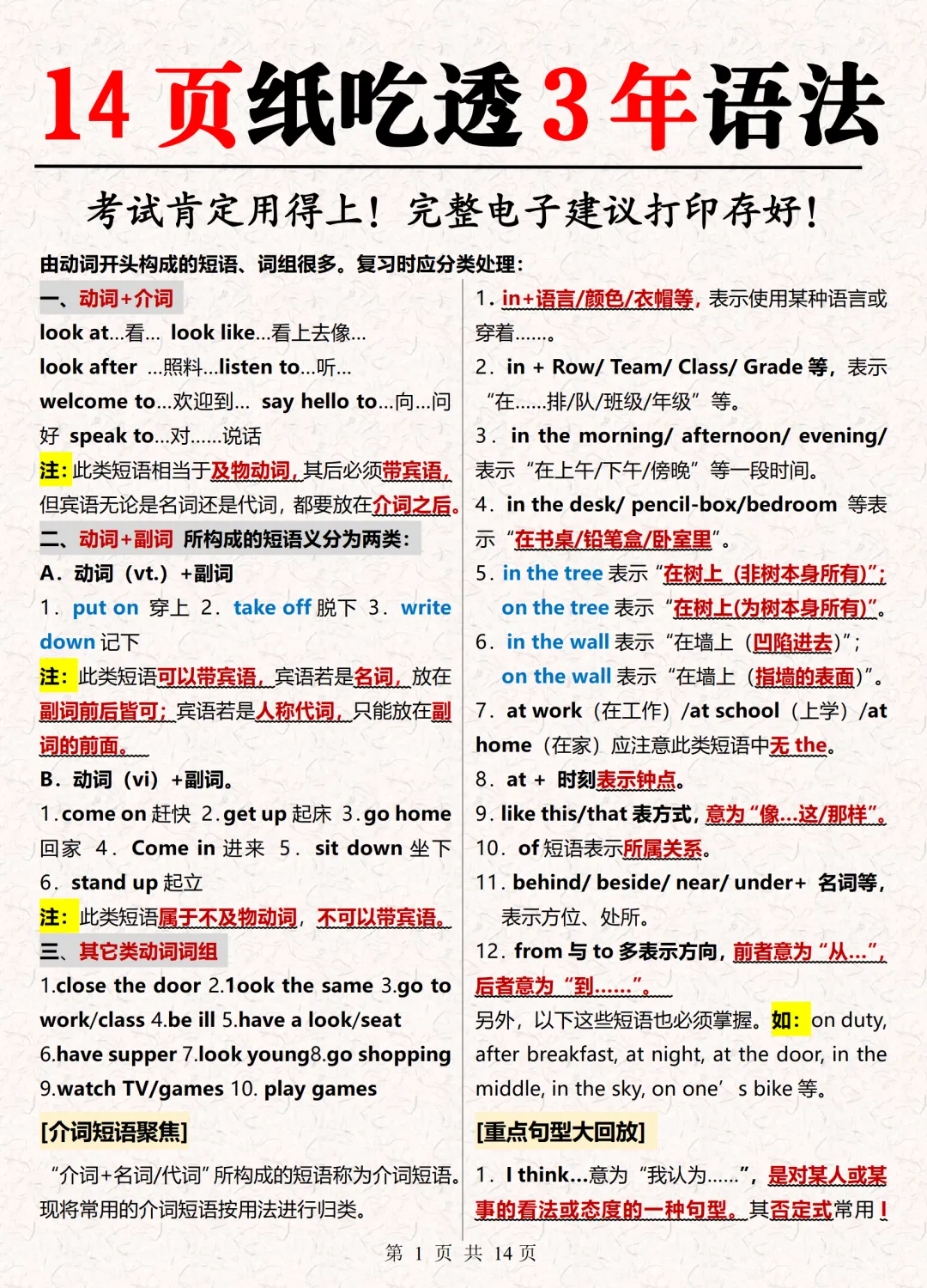 教你用14页纸吃透初中3年英语语法,可免费下载