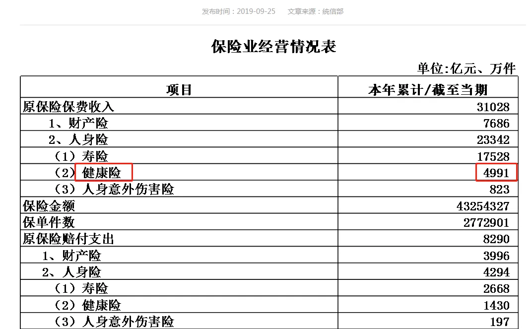 根据银保监会官方数据显示,2019年1-8月我国健康险收入为4991亿元,维持着超过30%的高速度增长。