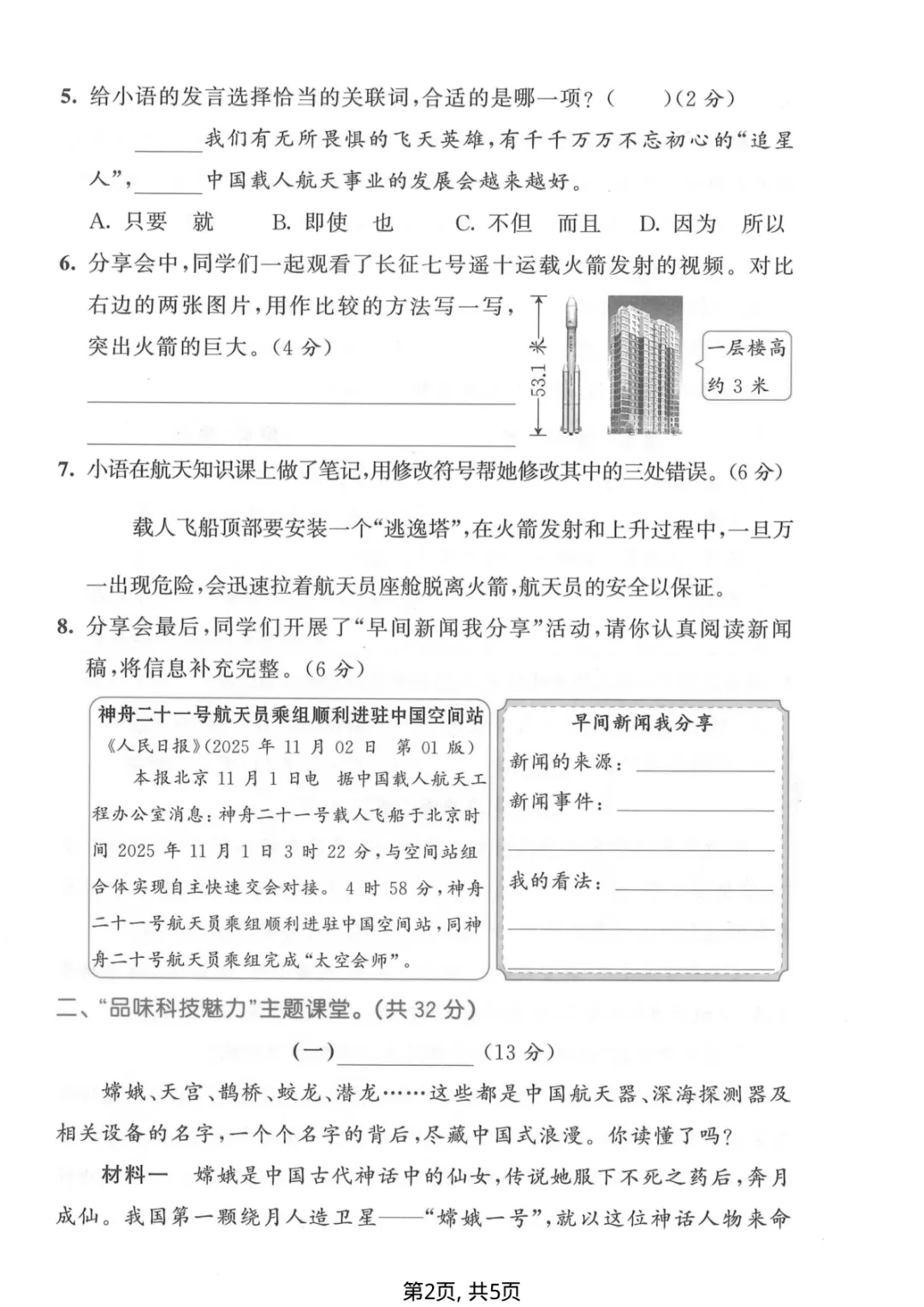 四年级(下)语文 第二单元情景测试卷电子版PDF,5页,免费下载