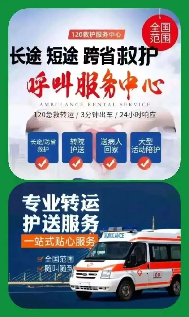 中福救护车出租转运公司,120非急救救护车接送病人预约护送。24小时为术后康复、危重患者及跨区域就医人群提供专业医疗转运服务,提供120救护车出租‖救护车转运‖私人120救护车(非急救)‖跨省长途转运‖危重病人转运‖市内转运‖术后康复病人转运‖高铁病人转运‖患者返乡‖大型活动赛事保障‖配备ICU设备:呼吸机▪心电监护仪▪吸痰器•微量泵•氧气▪急救药箱▪专业医护团队;就近派车