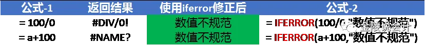 最后,再说一个iferror的函数。有时候,我们在处理excel数据的时候,可能会遇到一些问题,比如,100除以0——小学生都知道0不可以做分母,再比如计算字母a加上100的和——一个是非数值,另一个是数值。显然,针对这两种情况,Excel都会报错,并返回诸如#DIV/0!或#NAME?的提示。此时,我们就需要通过iferror函数来对返回的错误结果加以处理,如下所示: