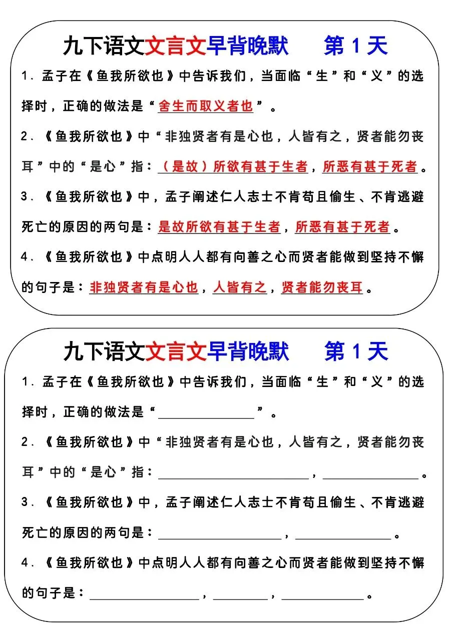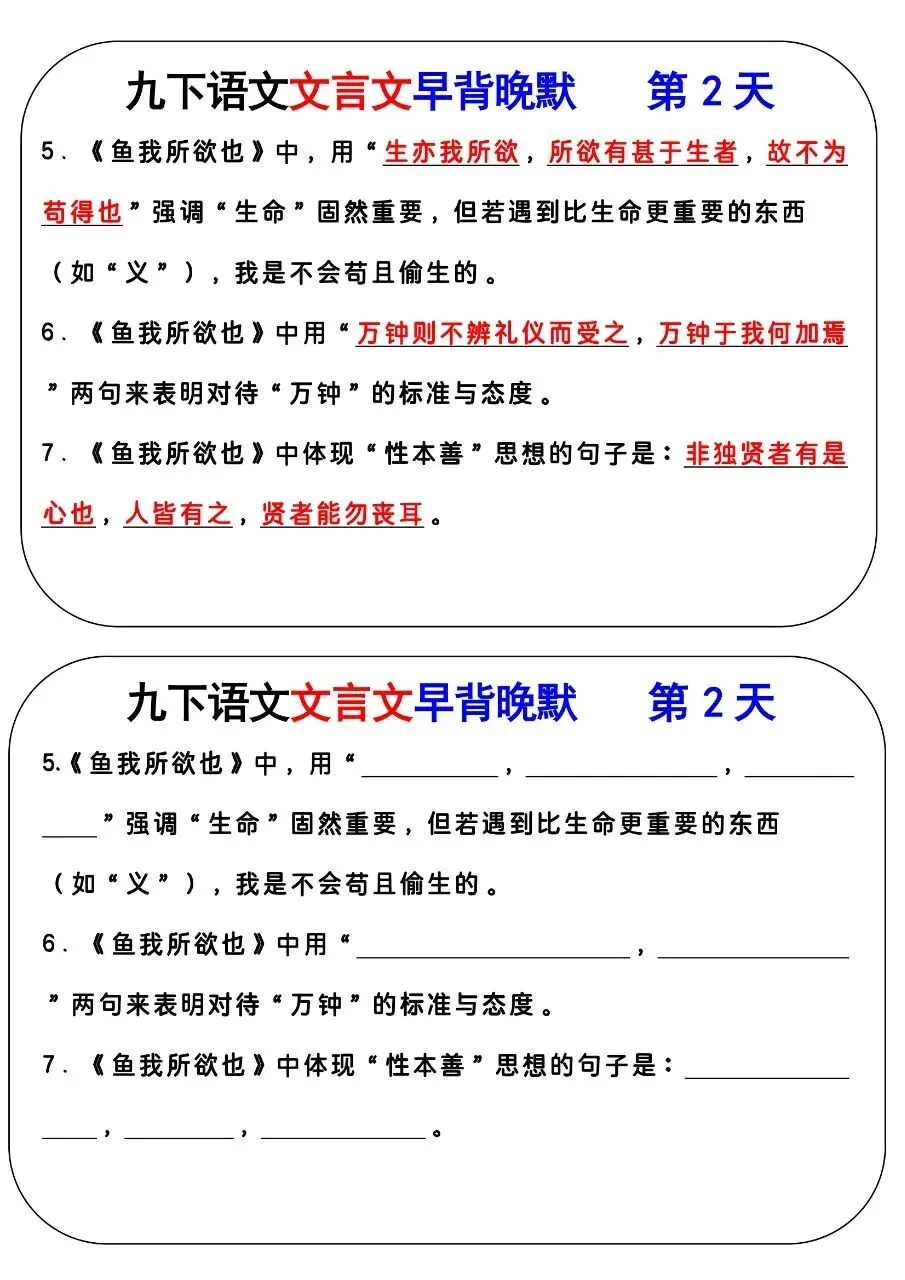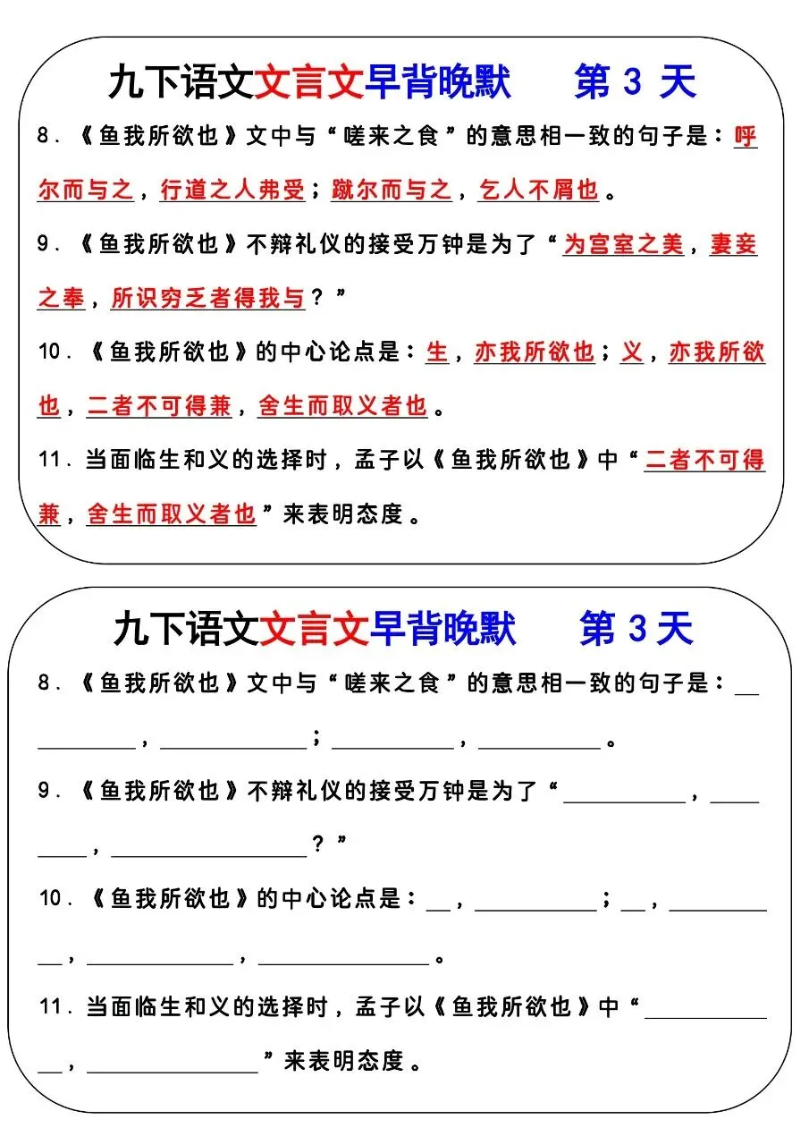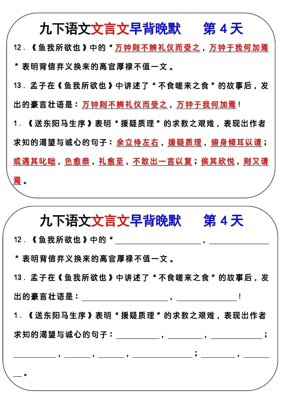 九年级下册语文|文言文早背完默15天(可下载打印) 初中资料每日更新,具体看完整PDF版本 (温馨提示:文末👇有电子版下载🔗) 新版九年级(初三)下册语文 文言文早背完默15天 △因篇幅有限,只展示部分资料截图△ ↓↓↓ 领取完整电子版: ①:点一点右下角的“👍”和“❤️”,感谢🙏 ②:在公众号对话框回复:1056 资料合集:👇👇 九年级下册数学 九年级下册英语