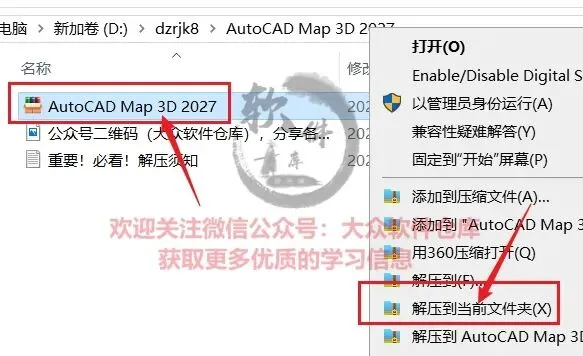 1.把资源从网盘下载到电脑上面并右键AutoCAD Map 3D 2027.exe压缩包选择解压到当前文件夹;