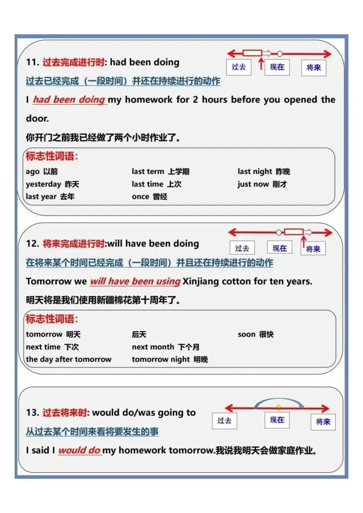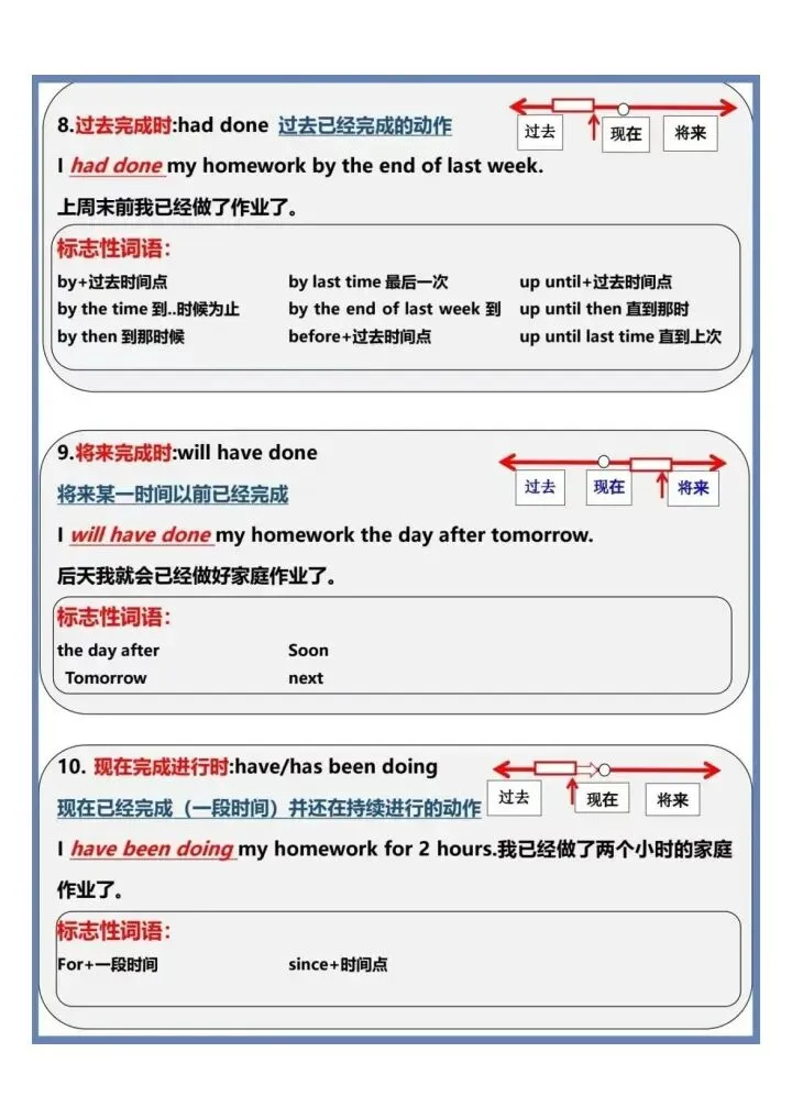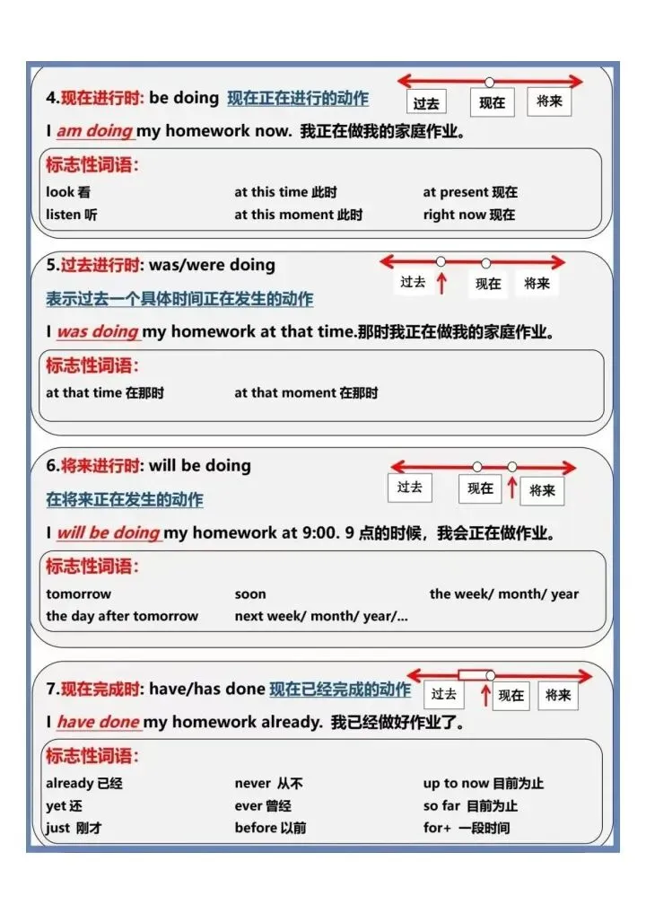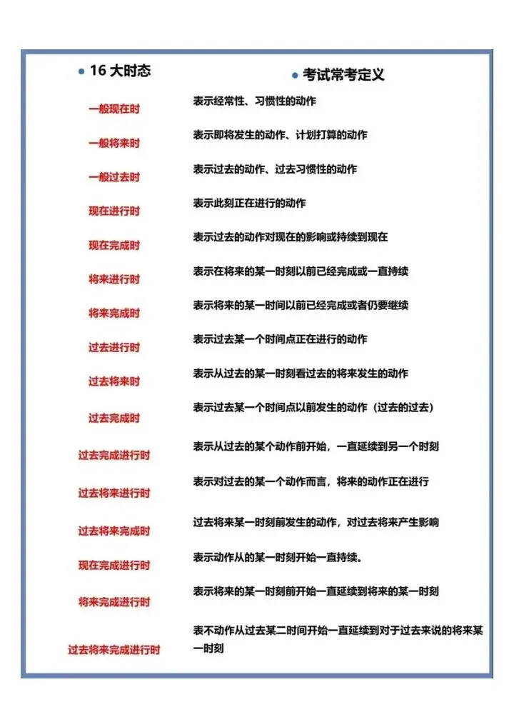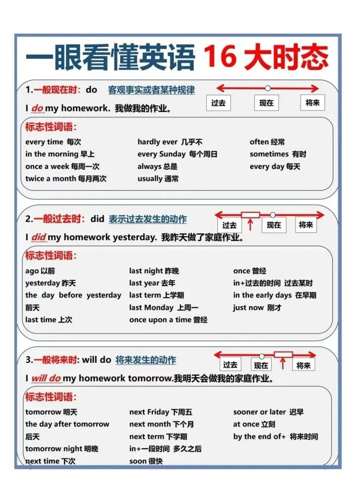 今日份分享一眼看懂英语16大时态汇总(完整电子版可打印)!这份资料已经整理成可打印版本,方便孩子随时翻看学习,建议家长先收藏,再转发给身边有需要的家庭,一起帮助孩子高效学习~