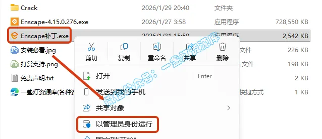 7.返回安装文件夹,选中【Enscape补丁】文件,右键选择【以管理员身份运行】