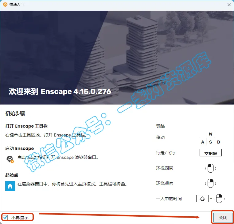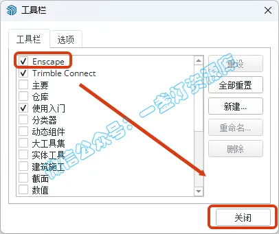 13.勾选【Enscape】选项就会出现Enscape工具栏,点击【关闭】