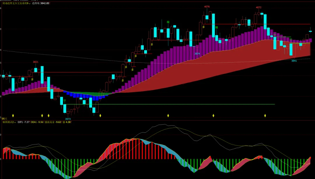 MACD衍生的波段强弱指标,柱线红强绿弱,黄色均线为波段是金,填充区域直观显示波段与均线关系。