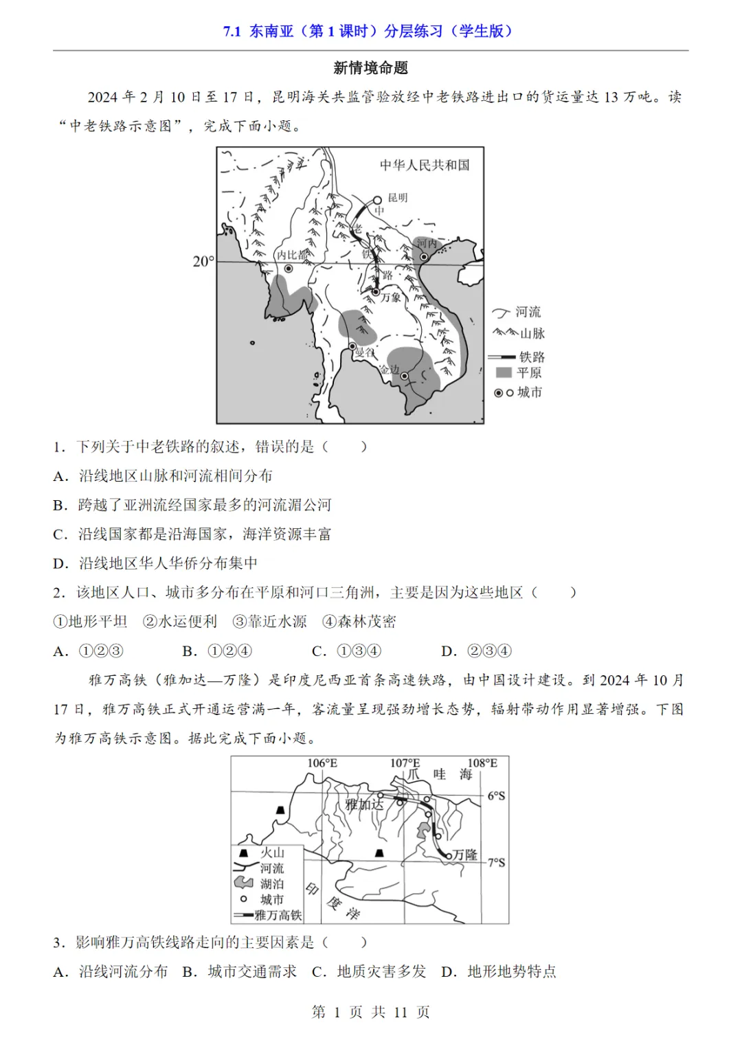 【免费下载】七年级(下)地理7.1东南亚 第1课时 分层练习(商务星球版),PDF电子版,可打印