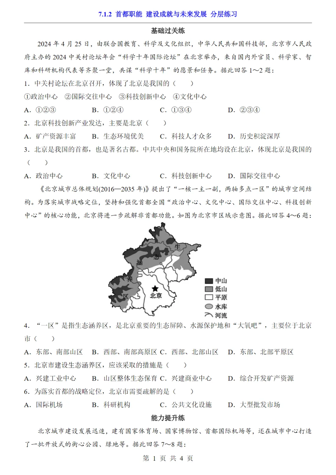 【免费下载】七年级(下)地理7.1.2首都职能 建设成就与未来发展 分层练习(中图版),PDF电子版,可打印