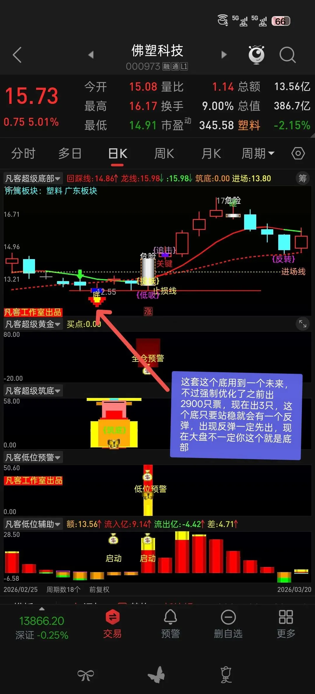 DRAWTEXT(向下>向上 AND CROSS(ZHSJ,0.1),低*1.003,’前 低’),COLORRED;