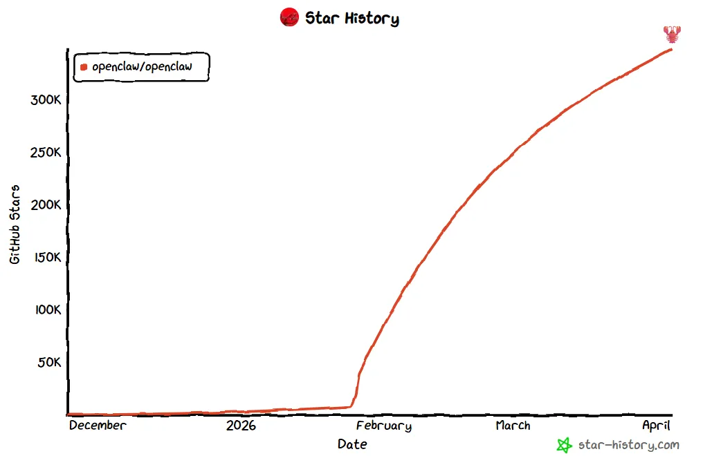 2025 年 11 月底,一个叫 OpenClaw 的开源项目在 GitHub 上线。4 个半月后,它有 35 万 Star,7 万 Fork,81 个发布版本,OpenAI、NVIDIA、Vercel 做它的赞助商。同期对比:Open WebUI 用了两年半才到 13 万,NextChat 三年到 8.8 万。OpenClaw 的增速在 GitHub 历史上都不多见。