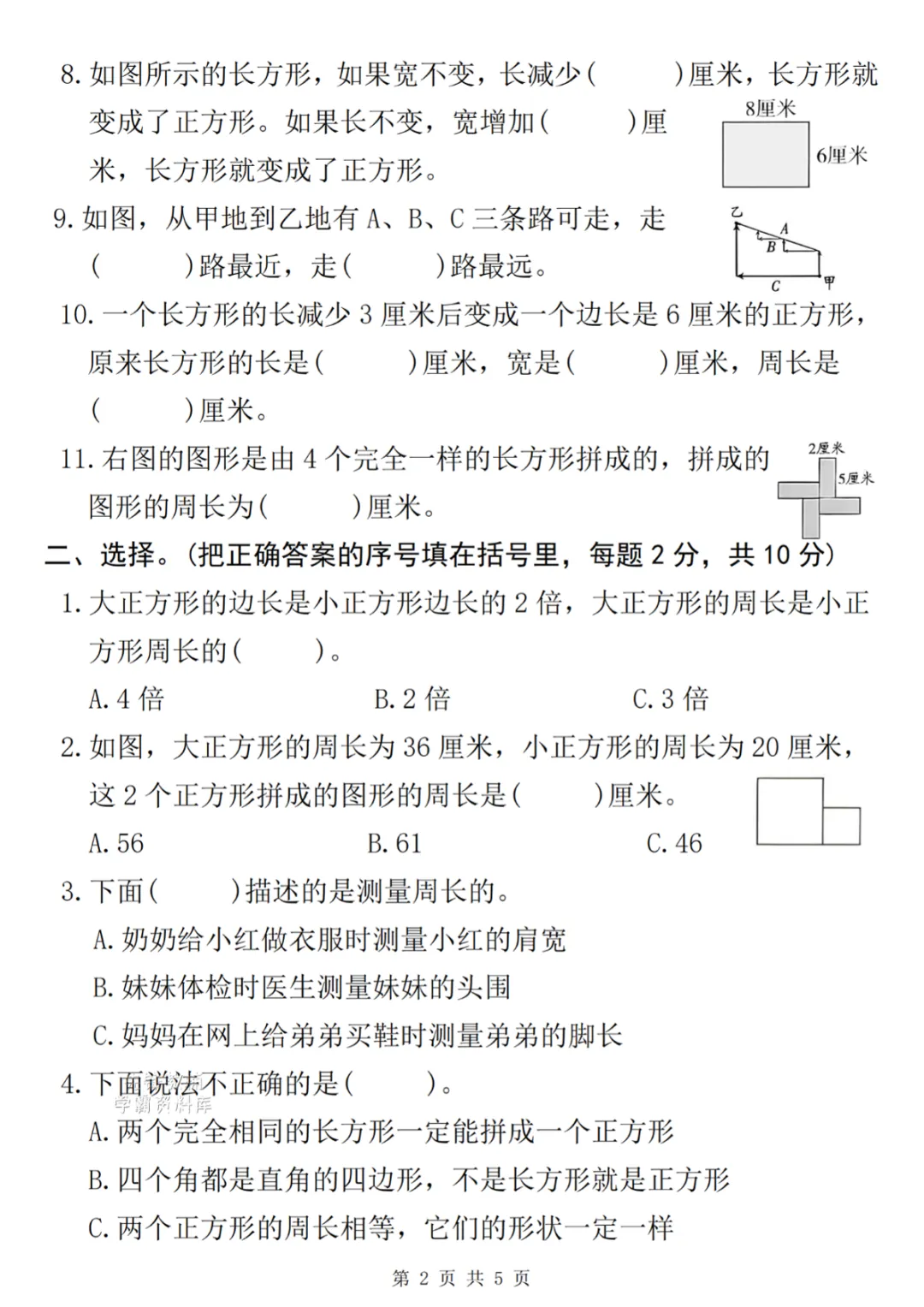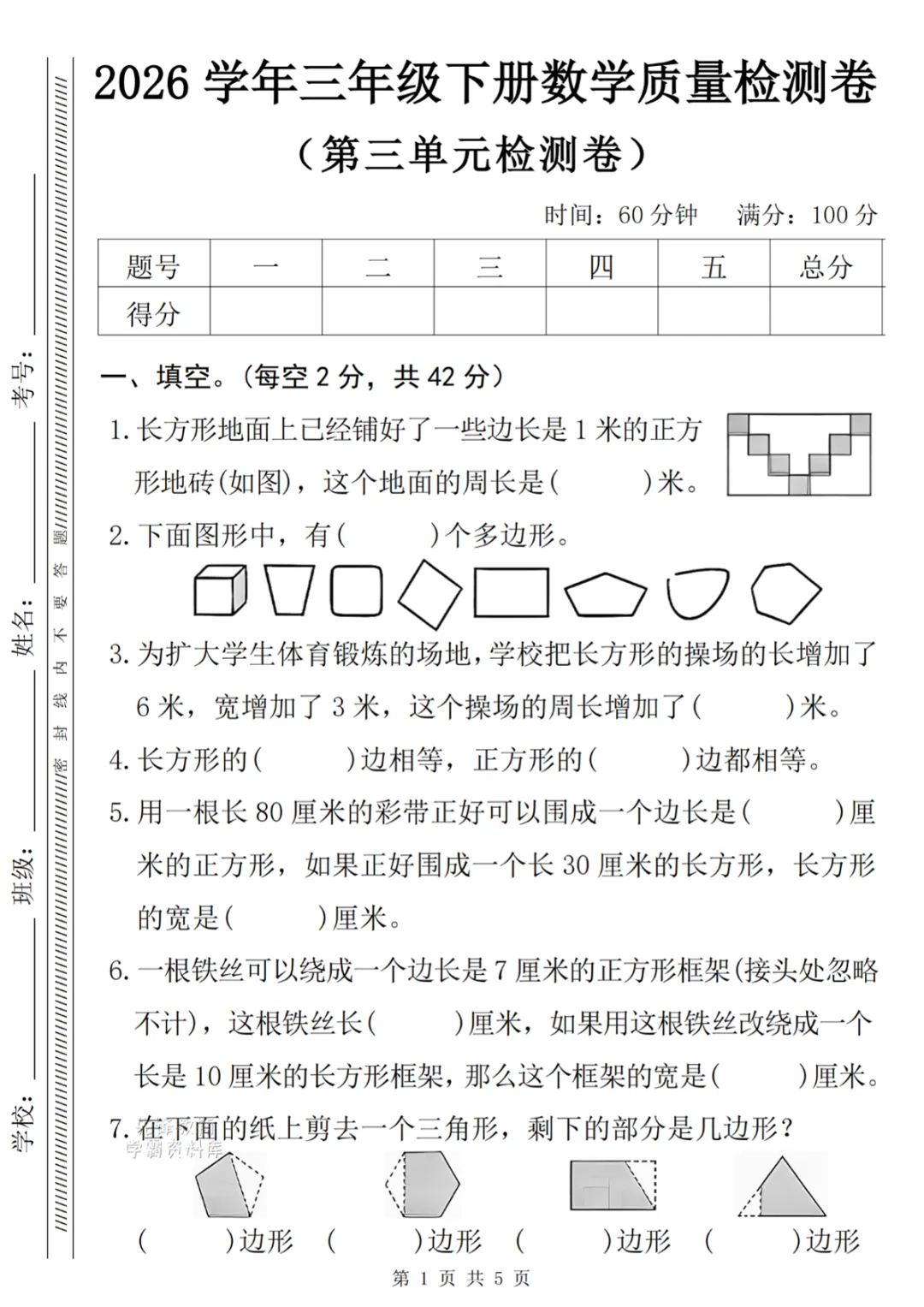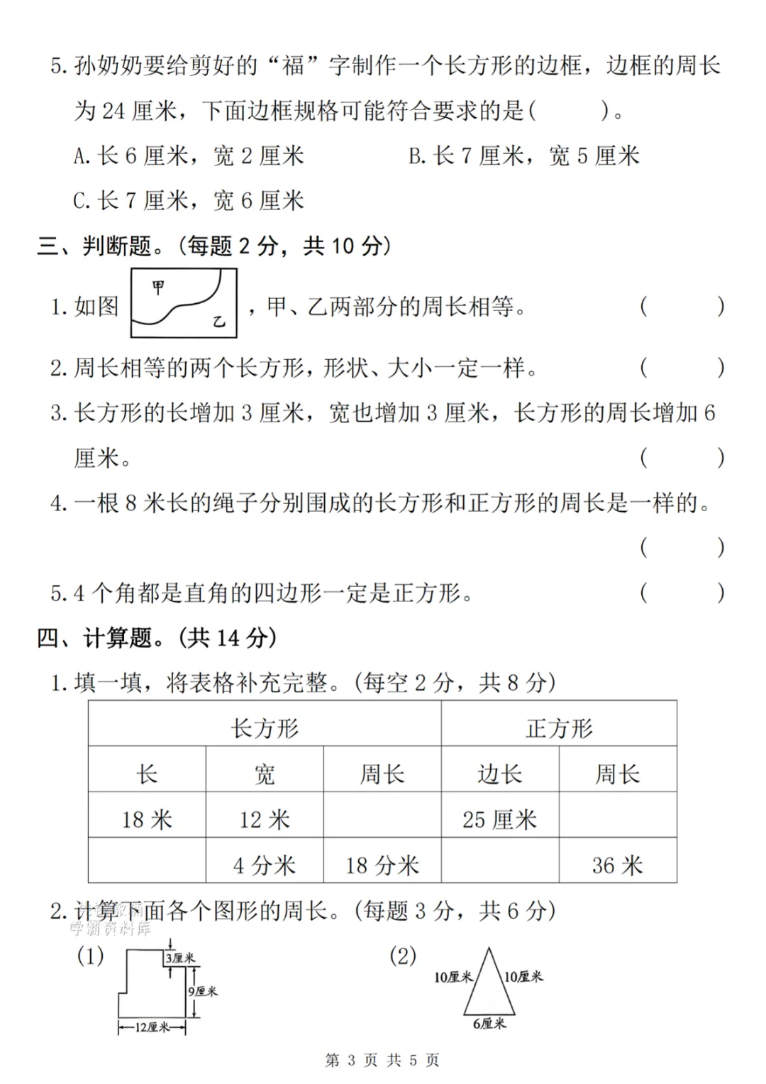 三年级下册数学第三单元质量测 电子版可打印