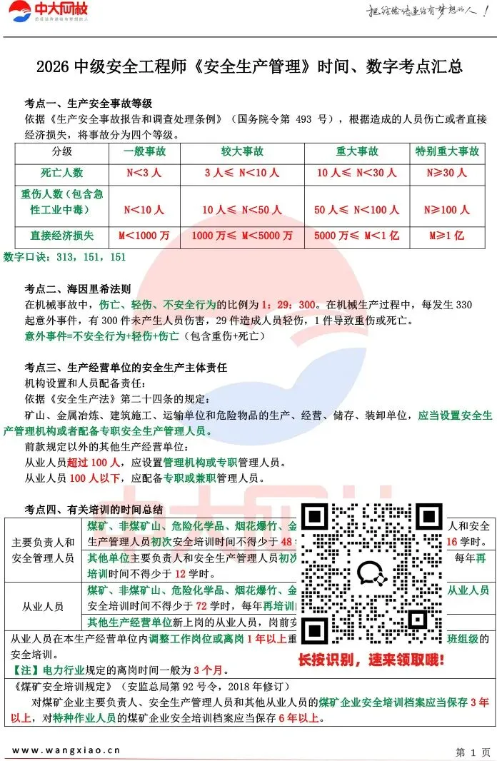 中大网校安全教研老师专为2026考生整理《安全生产管理》时间、数字考点汇总