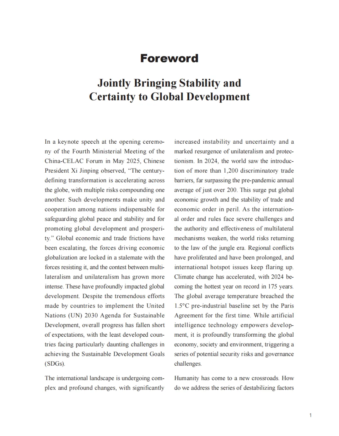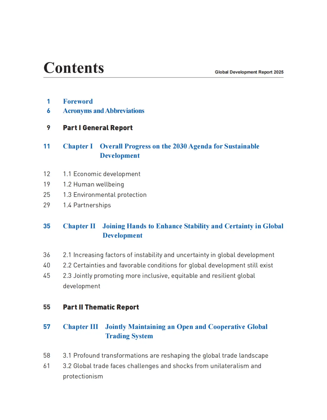 总报告(第一、二章):评估了《2030年可持续发展议程》的总体进展(涵盖经济、民生、环境、伙伴关系),并分析了当前全球发展面临的“不确定性”(如单边主义、地缘冲突、气候变化)与“确定性”(如全球化趋势、技术进步、全球南方的崛起),提出了促进包容、韧性与可持续全球发展的四大行动方向。