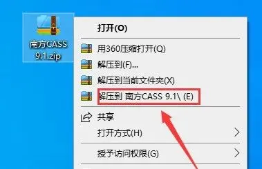 1、选中【南方CASS 9.1】压缩包,鼠标右击选择【解压到南方CASS 9.1】。