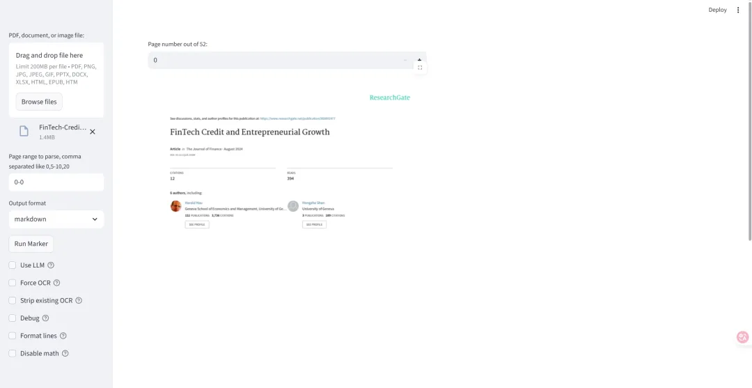 marker_single pdf/FinTech-Credit-and-Entrepreneurial-Growth.pdf --output_dir output --output_format html --page_range "0,5-10,20" --force_ocr