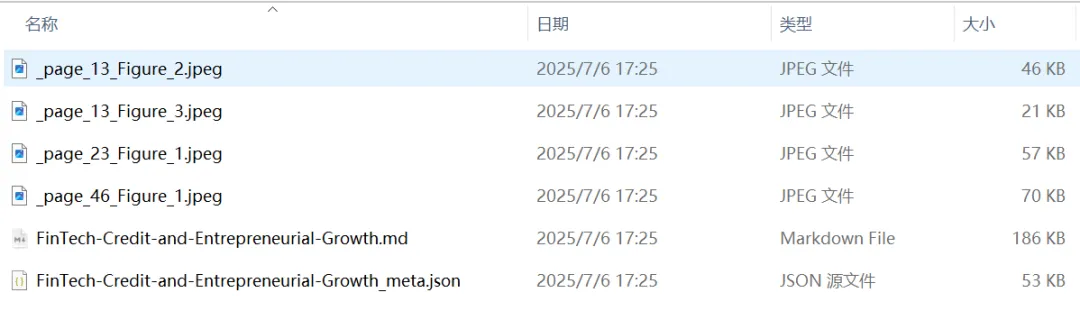 解析完成后,输出目录中将生成提取的图片、表格结构化信息的 JSON 文件和 PDF 详细内容的 Markdown 文件。