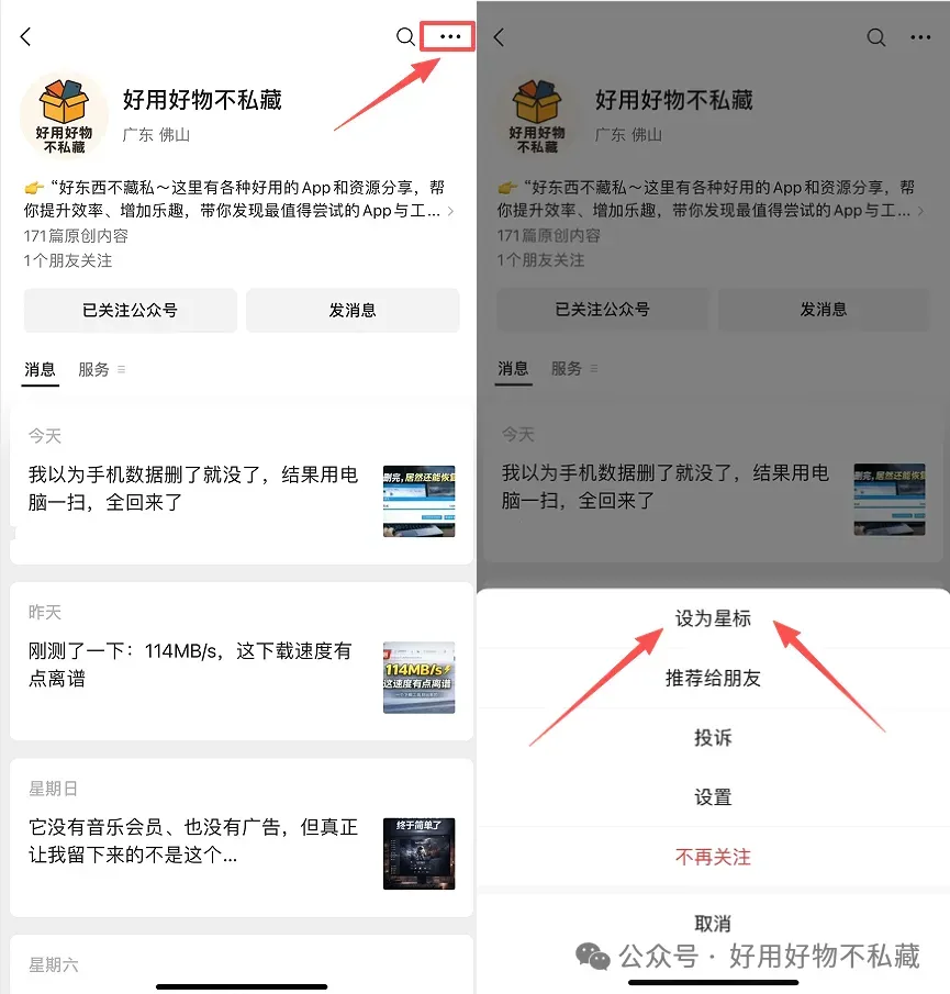 小伙伴们注意:好用每天都定时更新,但因为信息流乱序,不少人还是错过了干货!好用建议大家把本公众号置顶(设为星标★),以便及时看到推送,方法如下图:
