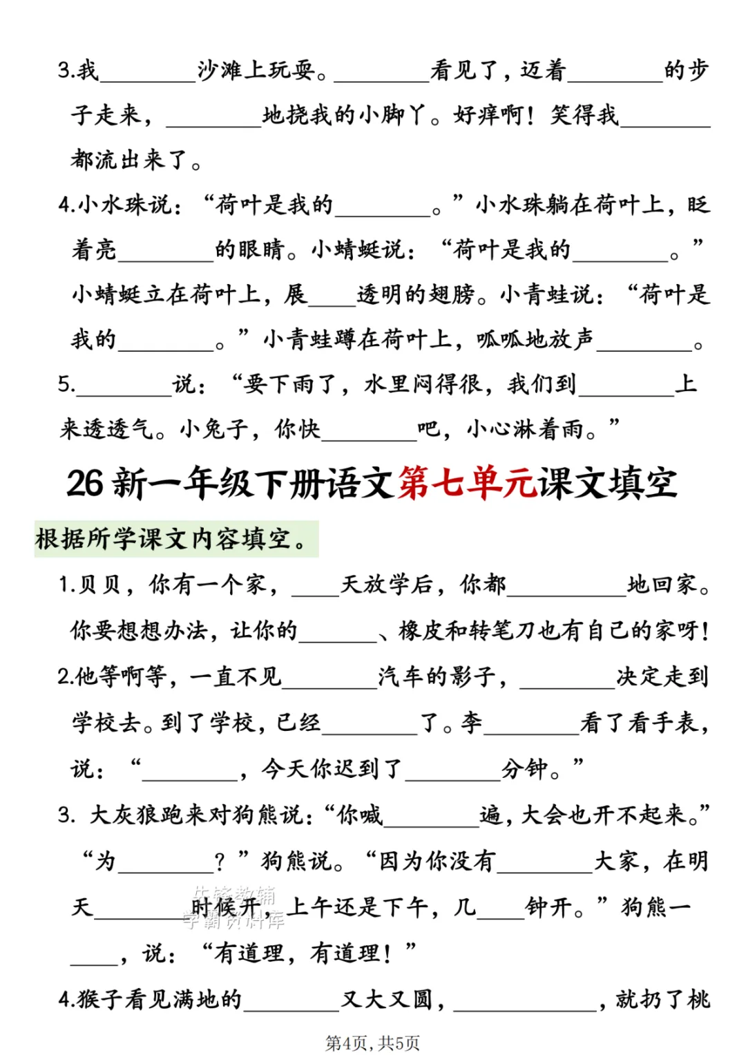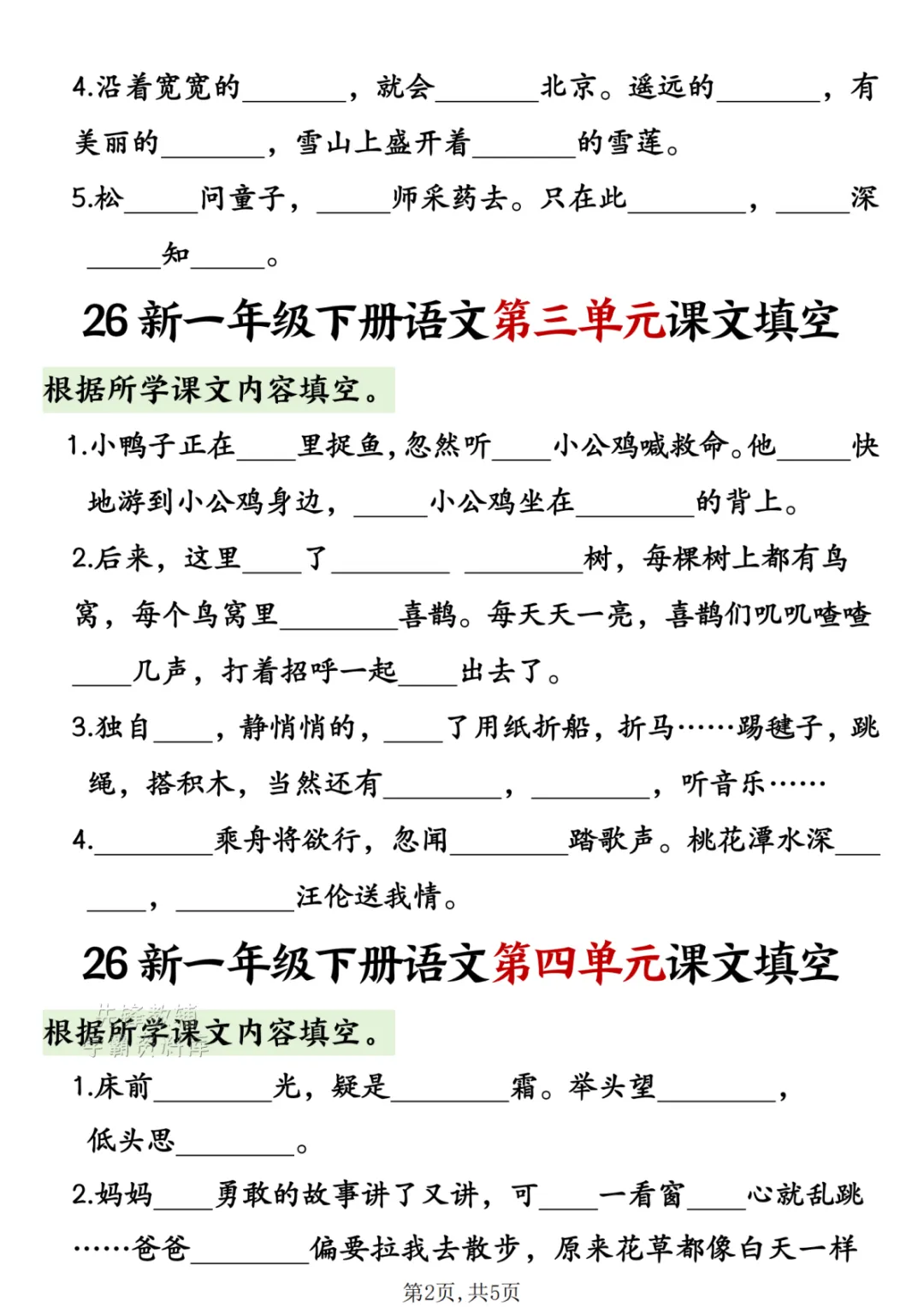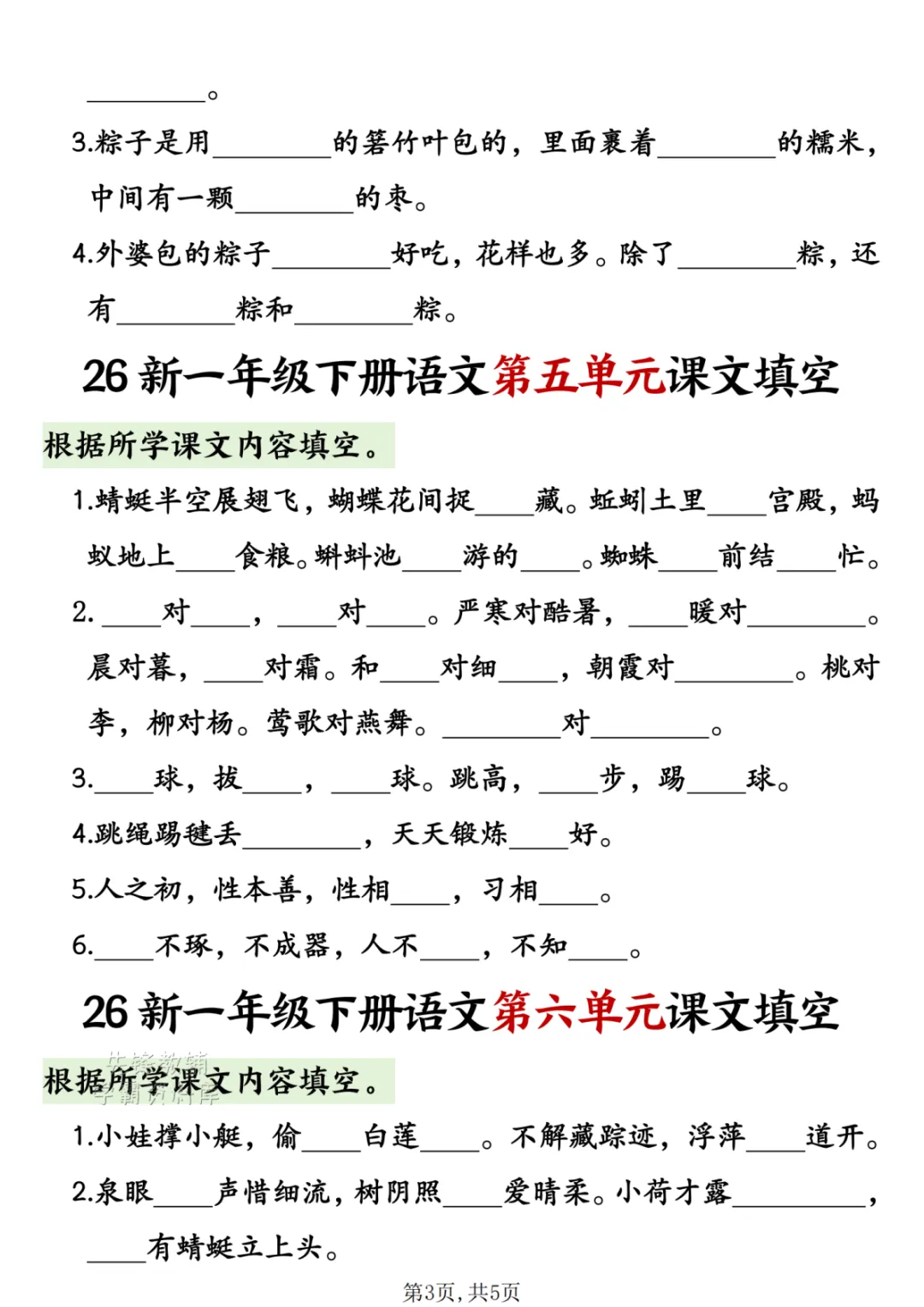 今日分享2026年新版一年级下册语文课文填空电子版可打印。这份资料按单元梳理全册课文核心内容,聚焦必背段落、重点词句填空,精准覆盖课文背诵、默写等高频考点。帮孩子巩固课文记忆、夯实语文基础,是课前预习、课后复习、单元检测的优质练习素材,轻松吃透全册课文内容✅