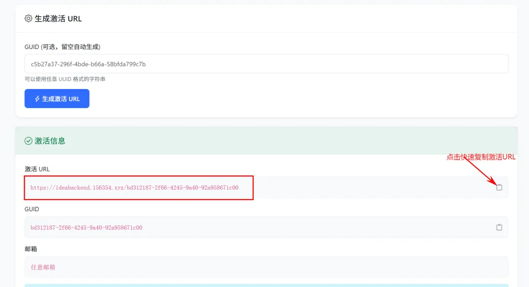该方法采用服务器授权的方式进行激活,所以进行激活时必须保证电脑联网。而且无需去别的地方生成GUID,网站直接提供,直接点击【生成激活URL】就能生成有效的URL。