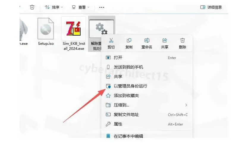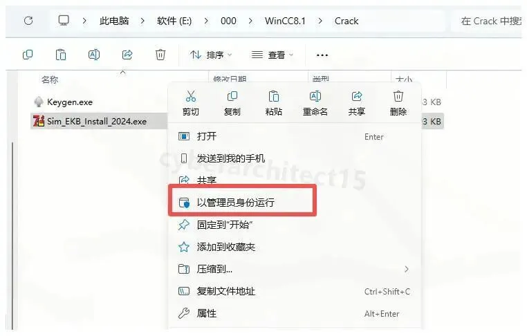 26、回到Crack文件夹,找到【Sim_EKB_Install…】程序,右键选择【以管理员身份运行】。这步是安装密钥管理,也很关键。