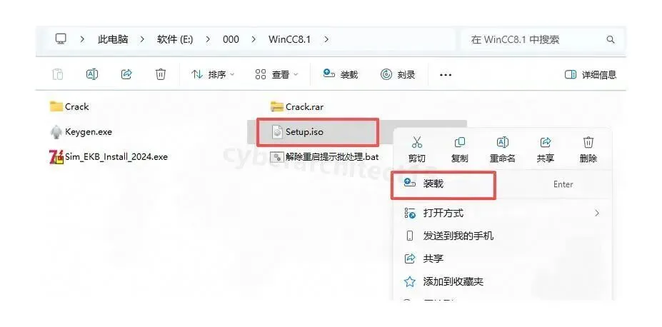4、回到文件夹,右键点击Setup.iso文件,选择【装载】。如果你的系统没有”装载”选项,可以用虚拟光驱软件打开。