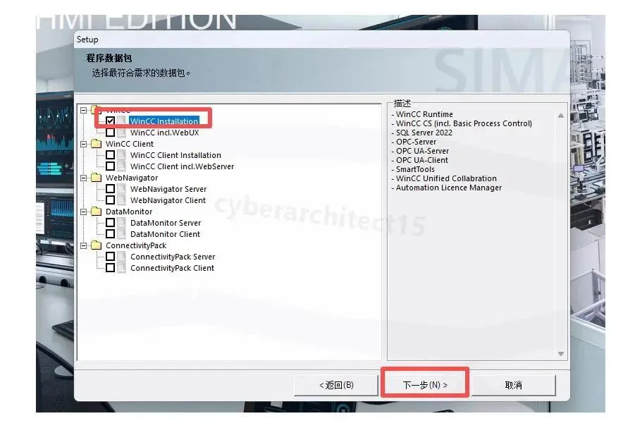 13、程序包选择界面,勾选【WinCC Installation】,然后点【下一步】。这一步很关键,别选错了!