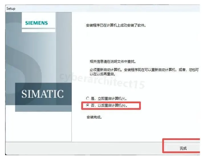 19、安装完成后,勾选【否,以后重启计算机】,然后点击【完成】按钮。先别急着重启,还有重要步骤。