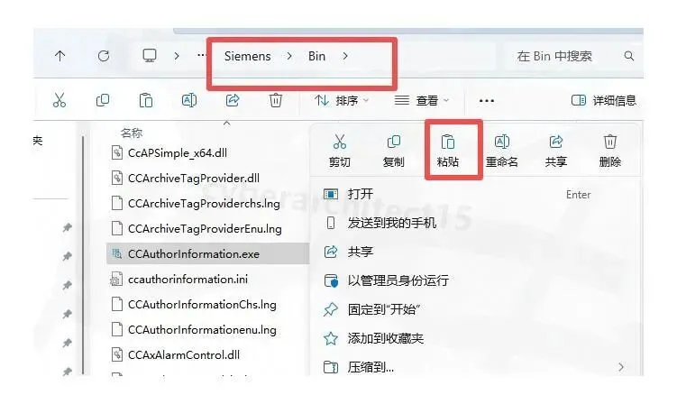 22、打开路径:C:\Program Files (x86)\Common Files\Siemens\Bin,在文件夹的空白处右键点击,选择【粘贴】按钮。