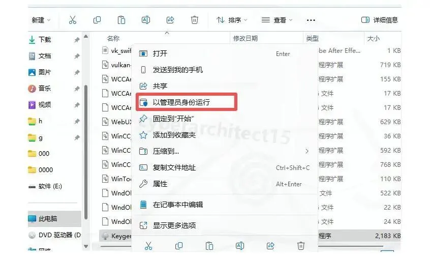 23、找到刚刚粘贴的【Keygen】程序,右键选”以管理员身份运行”。这步是设置软件注册信息,很重要!