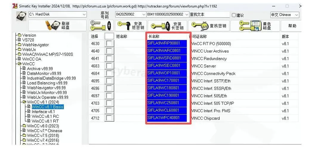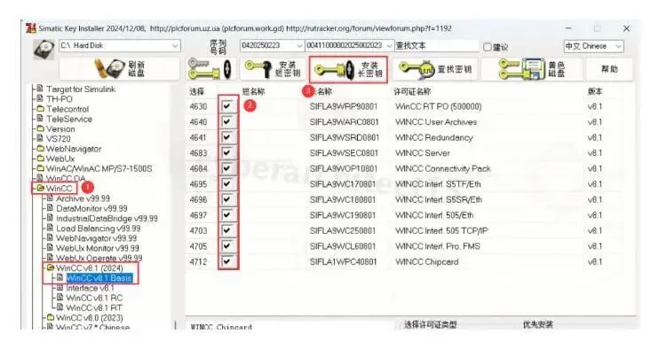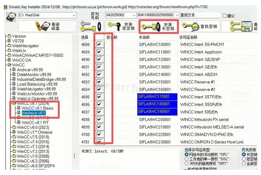 27、在打开的界面中,依次双击左侧的【WinCC】、【WinCC v8.1(2024)】、【WinCC v8.1 Basis】,然后勾选全部【短名称】,最后点击【安装长密钥】。这步是配置软件的功能模块。