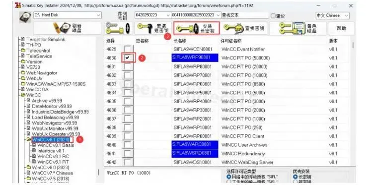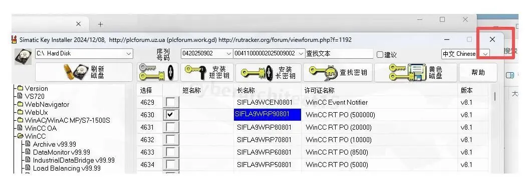 31、点击【WinCC v8.1(2024)】,勾选【4630】短名称,再点击【安装长密钥】按钮。这是最后一个需要配置的模块了。