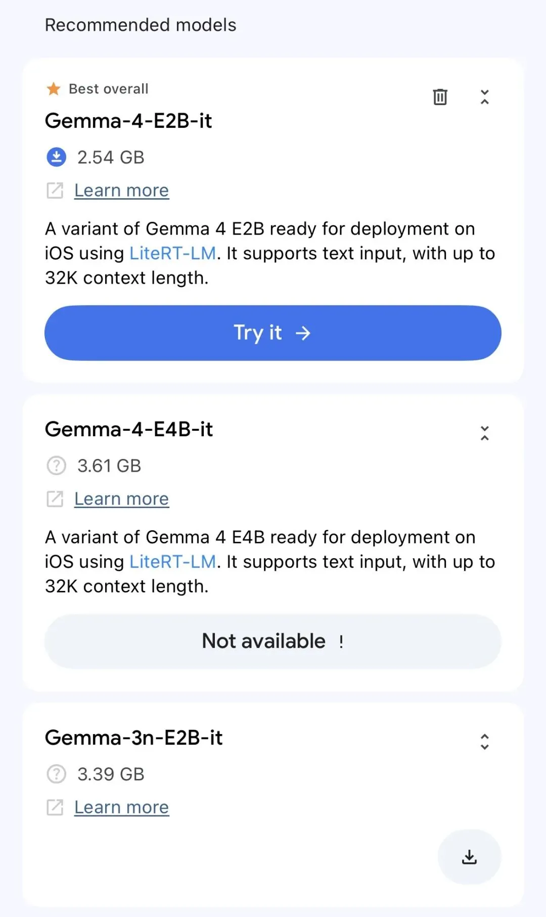 A系列芯片的iPad只能选Gemma-4-E2B-it,在M芯片的iPad上可以选择更大一些的E4B。