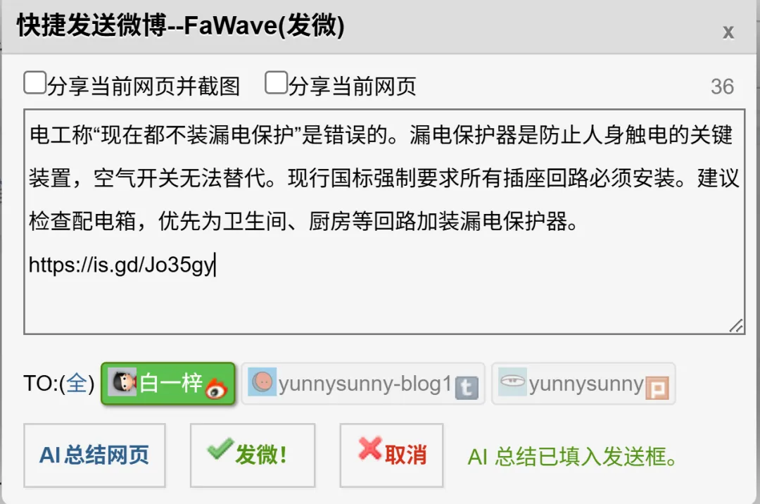 在重构 FaWave 过程中,我新增了网页 AI 总结能力,可基于当前网页内容生成适合直接分享的短摘要,算是紧跟 AI 时代的潮流了吧。也不枉我这么多天的改造,也算给给为老用户提供点新鲜的东西,算是给这次改造暂时画个句号吧。