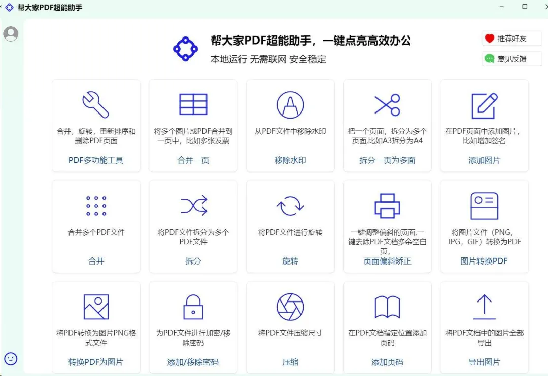 帮大家PDF超能助手是一款可直接在电脑上运行的本地PDF处理软件,不用联网就能使用,不仅永久免费,而且安全又稳定。