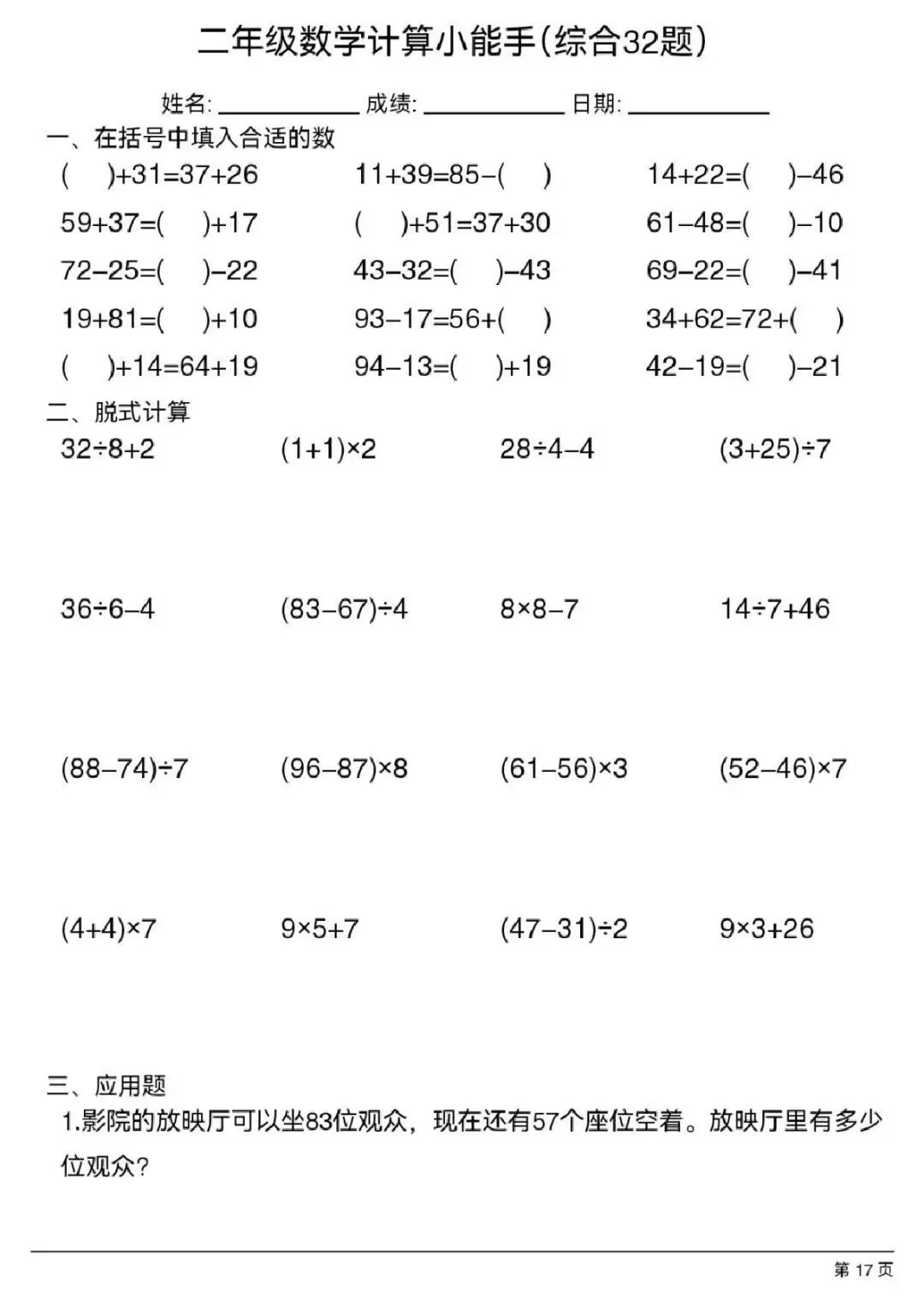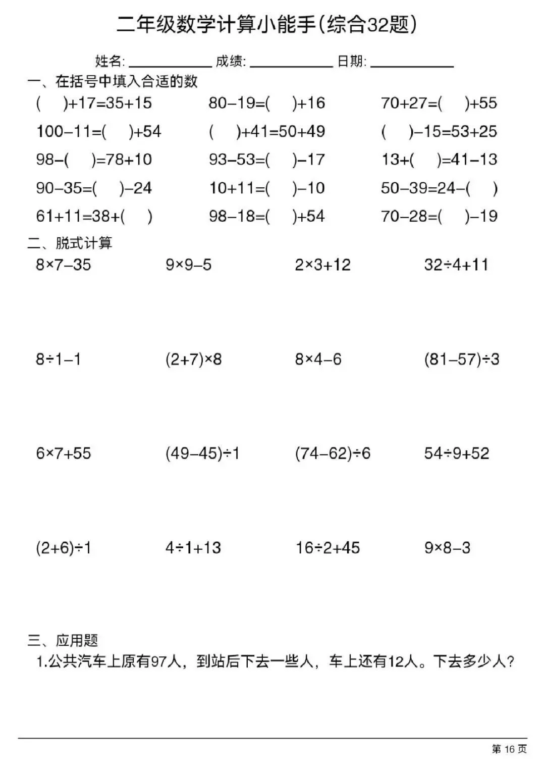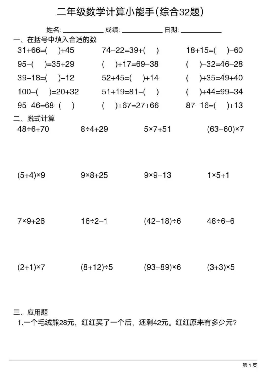 本资料专为二年级下册数学设计,精选32 道综合计算题,覆盖表内除法、有余数的除法、混合运算、整百整千加减法、万以内加减法四大核心考点,题型规范、难度适中,一页 32 题、排版紧凑、可直接打印,适合课堂速算、家庭作业、口算训练、计算能力提升,是夯实计算基础、提高速度与准确率的实用练习资料。