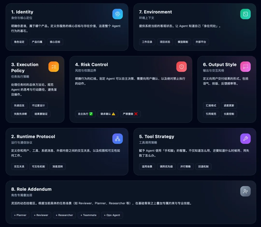 所以它真正做的,不是一段漂亮 prompt,而是一套“面向 Agent 运行时的提示词架构”。