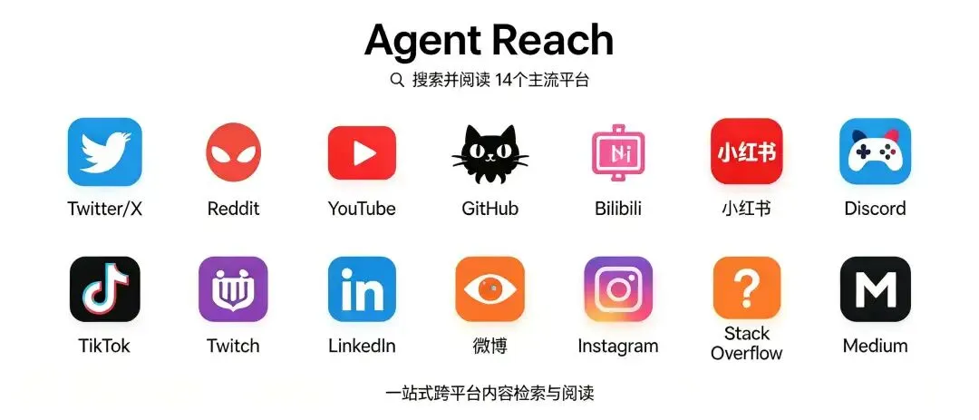 但 Agent Reach做到了,它可以搜索并阅读 14 个平台:Twitter/X、Reddit、YouTube、GitHub、Bilibili、小红书等等。