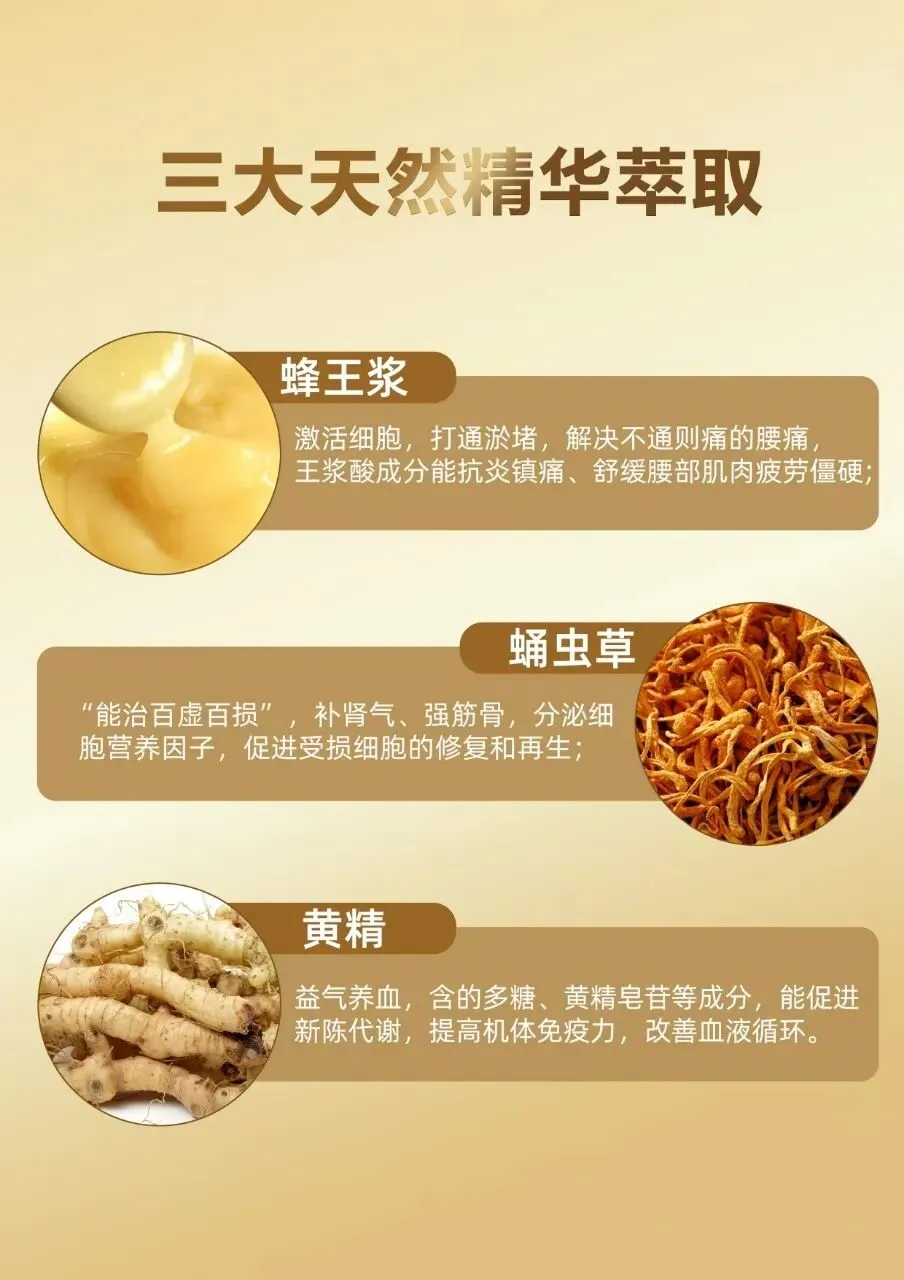 配料:仅含优等精华:蜂王浆精华 | 蛹虫草精华 | 黄精精华