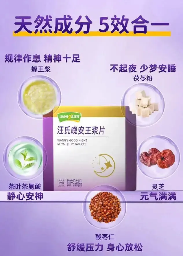 配料:蜂王浆(>50%)、茯苓粉、酸枣仁粉、茶叶茶氨酸、灵芝粉