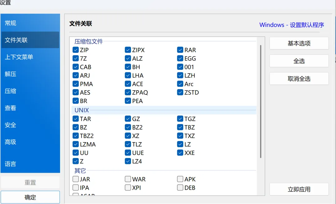 3.给大家看一下默认关联的压缩文件类型 大概有30多种,其他格式可以手动勾选