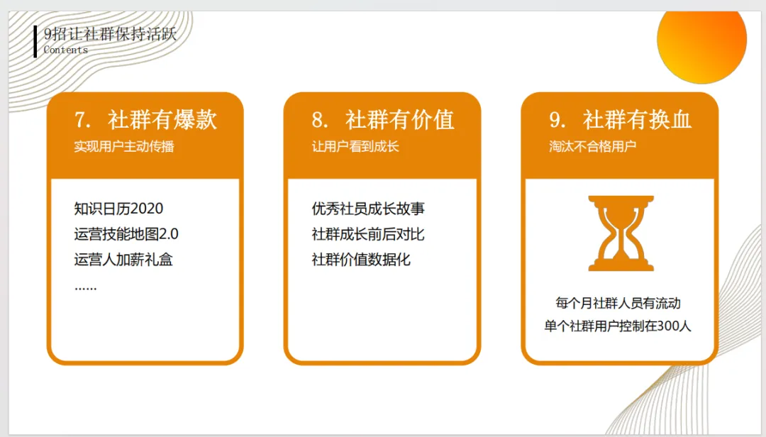 社群有换血:通过定期淘汰不合格用户、控制社群人数(如300人)和保持人员流动,维持社群活力。