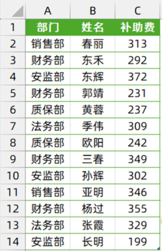 现在立刻打开Excel,照着下面模拟数据建个表(部门、姓名、补助费三列,数据随便抄点),咱边搞边聊~