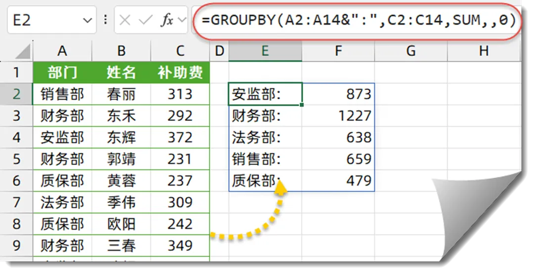 第二参数C2:C14:告诉GROUPBY“要汇总哪列的数”,这里就是补助费。