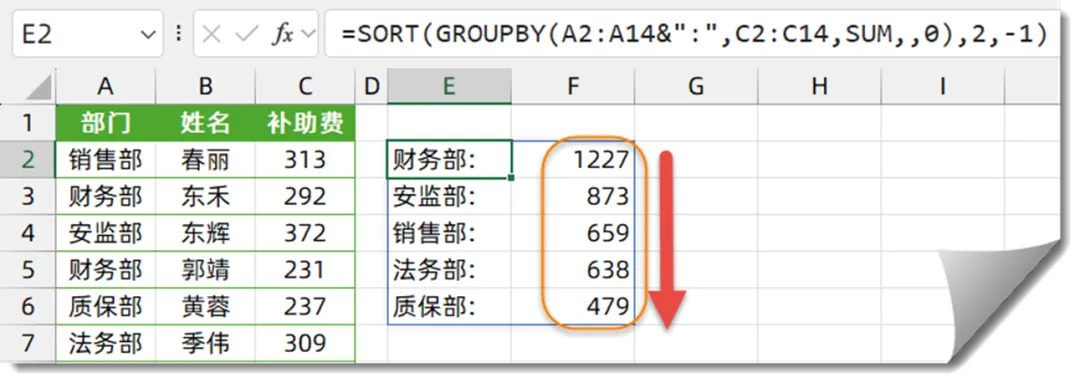 执行完后,GROUPBY会给每个“部门+冒号”组合生成一行,后面跟着该部门补助费的总和。就像班长把每个小组的总分算好后,列个清单给你~