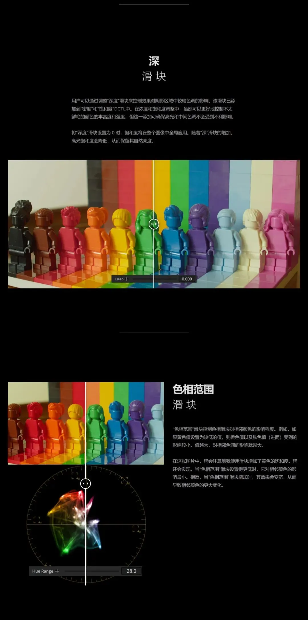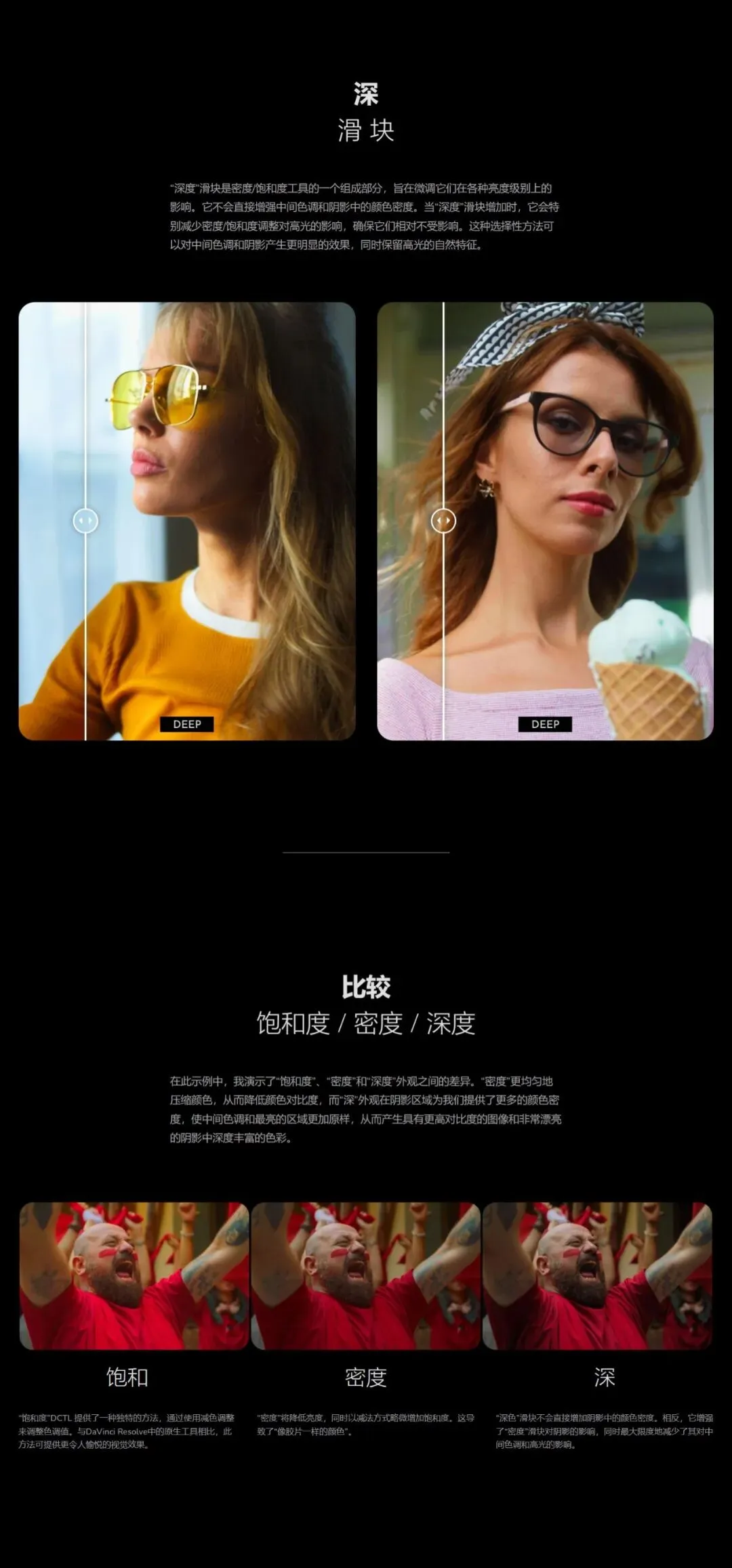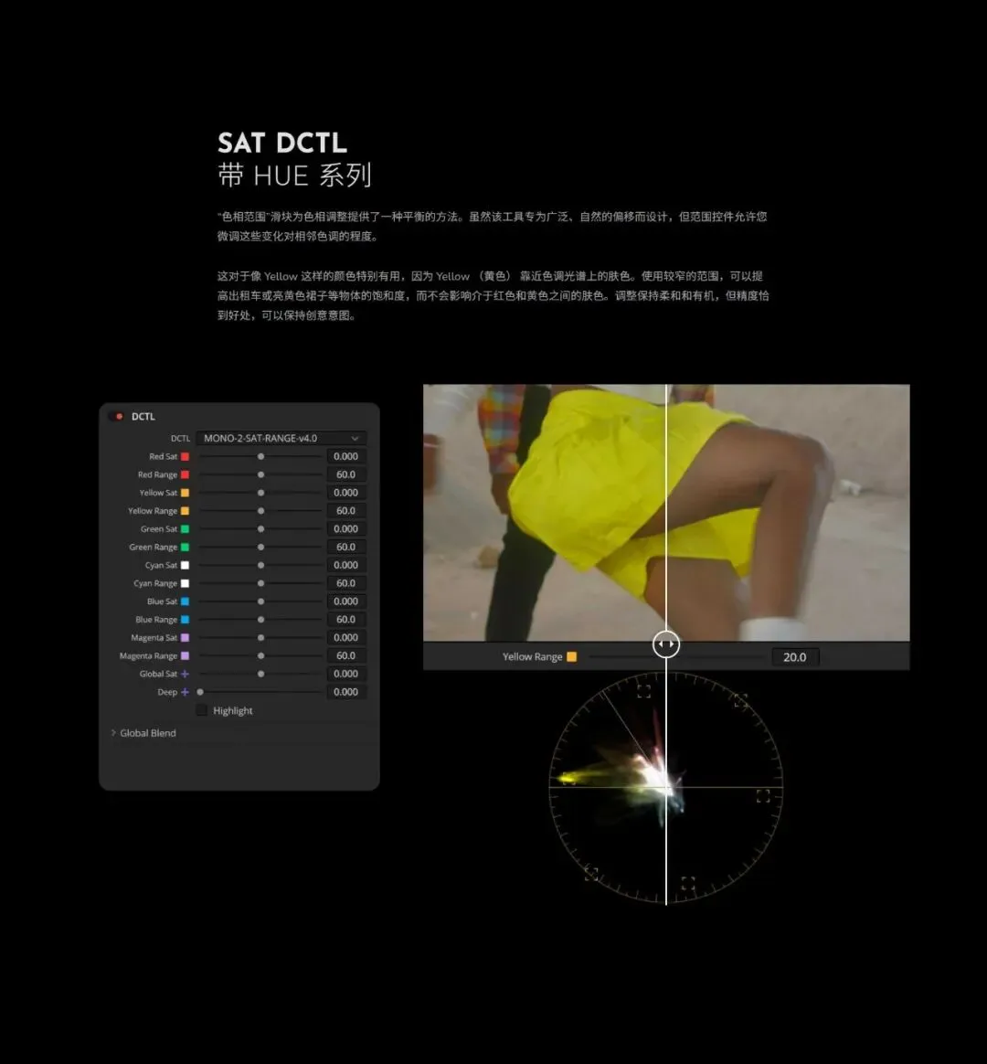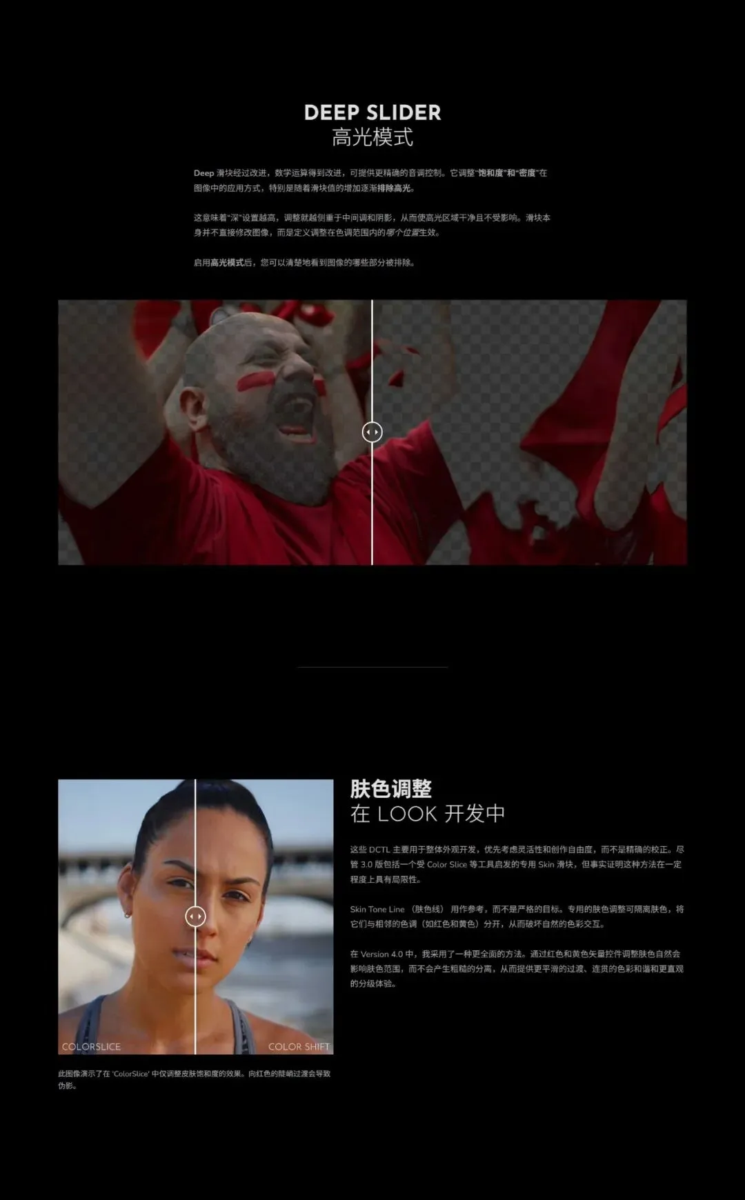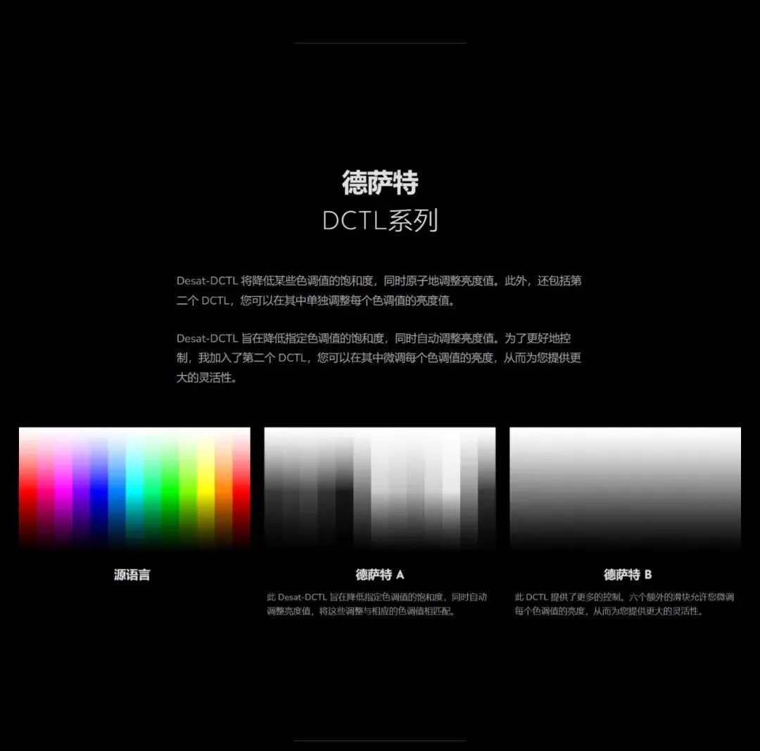 色彩空间:该工具旨在在 DWG 色彩空间中发挥最佳效果。DCTL 在 LogC 和其他大型色彩空间中也能正常工作,这会导致结果略有不同。
