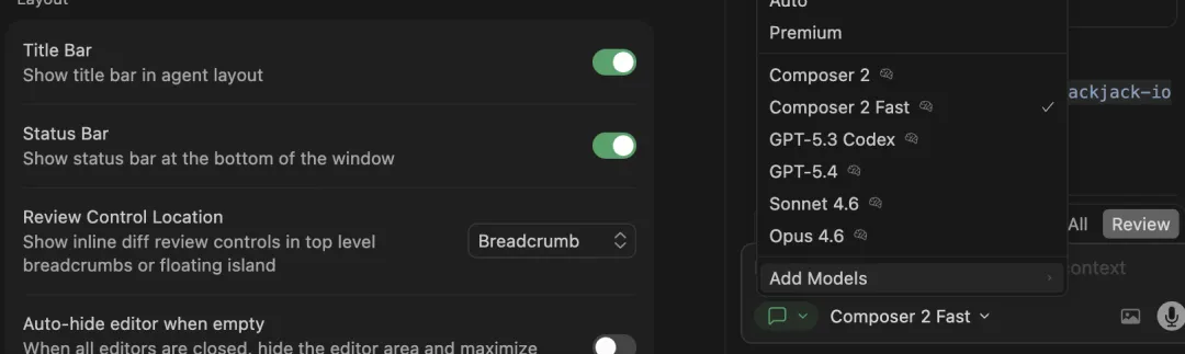 我选择的是一台 Mac + Xcode的开发环境,相比一年前 使用cursor,那时候体验还不够稳定,做了一个前端页面让我感觉磕磕巴巴,遇到了不少前端页面上的调试和优化的难题,这次换成做一个 IOS 的 APP,体验上好了不少,也可能是跟新的Composer模型有关,没有单独去尝试其他大名鼎鼎的 Opus 或者 Sonnet,活反正也给我干了,没遇到什么特别的报错和调试异常,甚至还让它 review 了一下生成的代码,流程体验下来丝滑了很多。