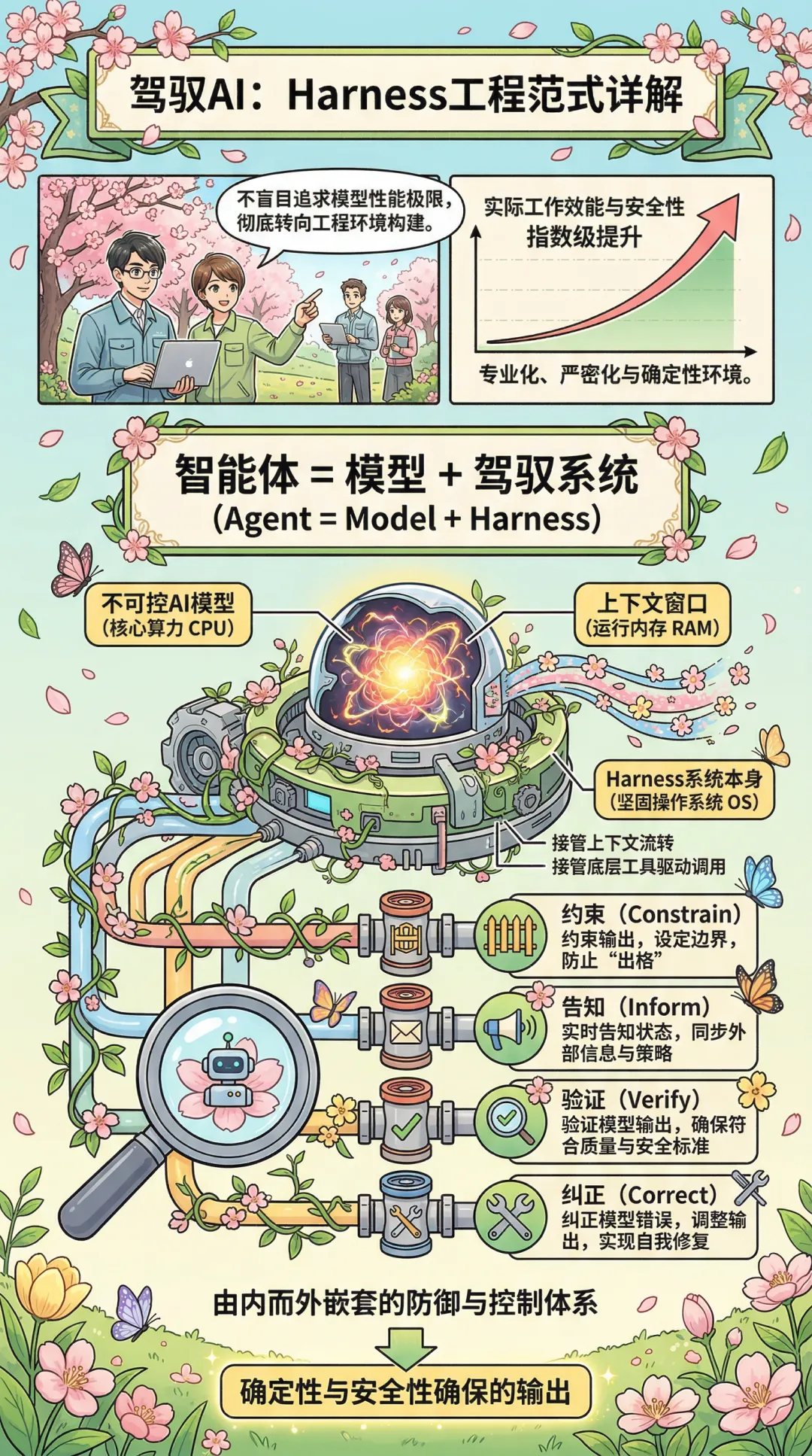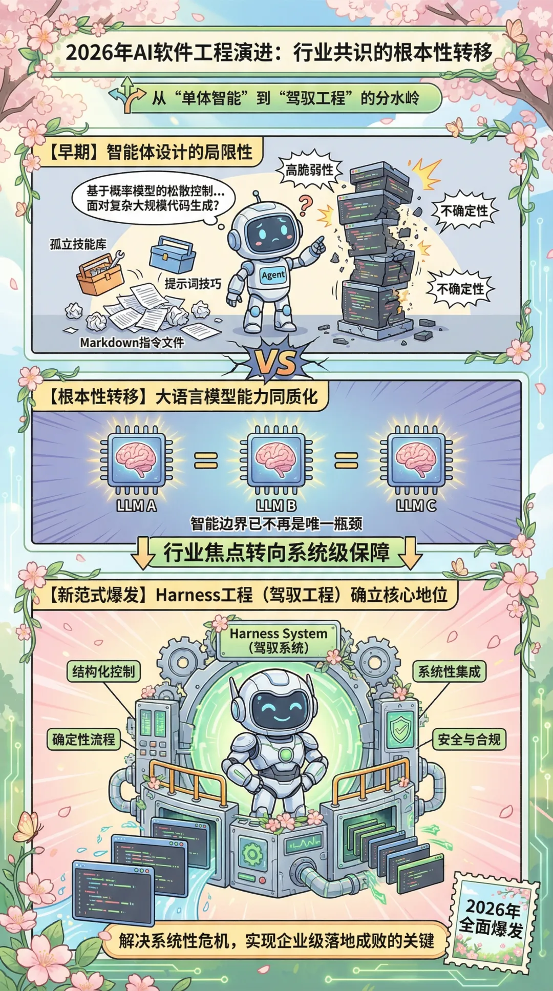 在2026年的AI软件工程(Structured Agentic Software Engineering, SASE)演进历程中,行业共识已经发生了一次具有分水岭意义的根本性转移。随着大语言模型(LLM)能力的日益同质化,单体模型的智能边界已不再是决定AI系统在企业级生产环境中落地成败的唯一瓶颈。早期的智能体设计往往依赖于复用的Markdown指令文件、提示词技巧或孤立的技能库,然而这些基于概率模型的松散控制手段在面对复杂的大规模代码生成时,暴露出极高的脆弱性与不确定性 ¹。为了解决这一系统性危机,一种被称为“Harness工程”(Harness Engineering,亦译为“驾驭工程”)的新兴软件工程范式在2026年全面爆发并确立了其核心地位 ²。