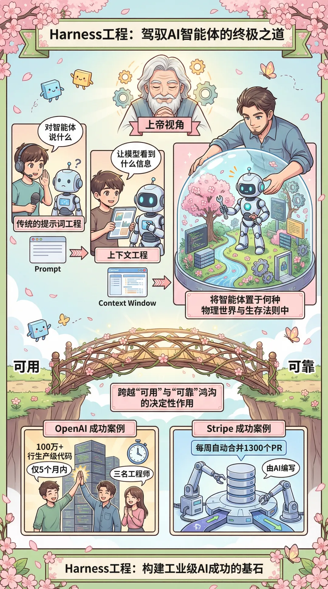 如果说传统的提示词工程(Prompt Engineering)解决的是“对智能体说什么(What to tell the agent)”的问题,而上下文工程(Context Engineering)关注的是“让模型看到什么信息”,那么Harness工程则是站在上帝视角,解决“将智能体置于何种物理世界与生存法则中(What world to put the agent in)”的终极问题 ³。从OpenAI仅凭三名工程师在五个月内利用智能体生成超过一百万行生产级代码,到Stripe内部系统每周自动合并1300个由AI编写的拉取请求(Pull Requests, PR),这些真实的工业级成功案例证明了Harness工程在跨越“可用”与“可靠”鸿沟中的决定性作用 ³。